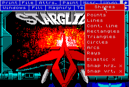 All the facilities of Art Studio are available on the advanced version with the addition of the ZX Microdrive controls, filing facilities for user-defined Fill Patterns and Paint Brushes, Ramdisk and Scrapbook plus an extra ‘arc’ shape in the SHAPES menu.