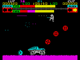 In a neat touch it is we, the games players, who are blamed for the predicament our hero finds himself in. It seems none of us was quite good enough at assembling his rocket in Jetpac, and now its various stages are disintegrating in warp space. Luckily he manages to crash land on a strange planet where he is stranded with his Hyperglide Moon Rover and a bunch of the most ferocious aliens yet.