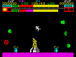 There are enemy bases some distance from the Moonglider, an indicator at the top of the screen points in their direction. These can be bombed by carrying. the bomb and dropping it on the base. The problem is that the base is too far to carry it in the air, because Jetman only has a severely limited fuel supply, and it drops faster if he’s carrying something. So he has to drop it on the bonnet of the vehicle, get in and drive, get out, make bridges, get in, drive until reaching the base, get out, pick up the bomb, drop it — and all without getting killed off.