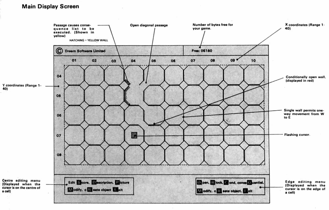 The central playing ground is the Main Display Screen displaying a portion of a 40 x 40 cell map. Each cell is octagonal and represents a room with eight walls. A cursor pinpoints the editing location and the co-ordinates of every cell are displayed. In the upper right-hand corner is the memory gauge, indicating the amount of free bytes left. Below appear the various menus with command selections.