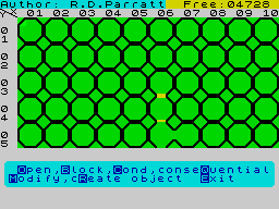 Upon selecting CREATE from the Outer Menu, all cells are restored with all walls intact and all objects destroyed. The basis of the system is to modify or knock out the walls of the cells, to create descriptions and if required screen pictures for the cells, create objects, etc. The player, all living beings, treasures, stairs, doors, keys, etc, are all treated as objects and must therefore be created individually. To any object is allocated a name, a score, a weight, a (starting) position, commands from the verblist to which it reacts and descriptions, when encountered in a room.