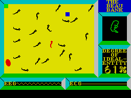 This stage is similar to the last in which you must touch the lips with your cursor (!) as they approach your body; later on eyes replace the lips. As a game, this stage is quite easy and it is the last program on side one. The graphics are intriguing, with the sensuous movements of the lips and the hypnotic track by Donna Bailey as The Machine. At this stage, you turn over both tapes, reload and re-synchronise side 2.