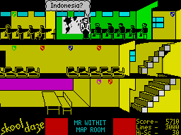 This may all sound involved and fun, and it is, but the bare bones of the plot don’t even begin to explain how hard the task is made by the ants nest building of a school! It swarms with kids and teachers, the former milling innocently around, bopping each other in the eyes, scrawling rude messages on the blackboard, tripping up masters and generally causing havoc to Eric’s endeavours; the latter handing out lines, ringing bells to change classes, asking daft educational questions, and generally being just like school teachers. Quite honestly, the Department of Education should have this game suppressed before it really causes trouble...