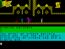 Vocabulary is surprisingly particular as you must type in the exact letters to make up the required words with only a few stock abbreviations for left (l), right (r), up (u), down (d), passage (p) and quickly (q). However, editing makes full use of the Spectrum cursor movement and delete functions which greatly facilitates entry. ENTER repeats the last command even after starting to type something else if this is first deleted. Input can be, and often must be, quite lengthy and involved, e.g. ATTACK THE GUARD WITH THE MIGHTY AXE and UNLOCK THE DOOR WITH THE GOLDEN KEY. The program will accept all words it has displayed.
