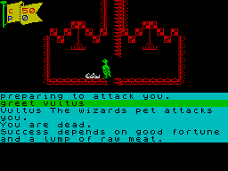 When the game loads you are at the start of adventure one. At any time you can switch to the start of a different adventure by entering, for example, ‘adventure eight’. Status (or ?) gives information regarding the adventure you are in; e.g. Adventure 1, Strength 25, Provisions 25, Luck 10, Performance 80 (how much of the adventure you have completed). Further information regarding what you are carrying, the spells you know and what you are wearing is also detailed. You can wear one item on your head and one on your body; if you remove something you will then be carrying it. You begin each adventure with a supply of provisions eaten in quantities from 1–12 to increase your strength, e.g. EAT THREE items of food along the way replenishes strength depleted during fighting and running.