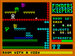 There are two possible objects in this game; either you may elect to collect as many valuable objects as you can and escape from the castle, or you may collect the treasure to please the king and princess and join the polygon table. Finders Keepers is an arcade adventure, and ‘adventure’ in quite a literal sense, because when you are next to a white triangle you can examine or get it. On getting, you are given an inventory of what you already carry, and when the limit of five objects is reached you have the choice of dropping something first. Some objects react to form other substances, sometimes more useful than the original two, sometimes less, so finding a philosopher’s stone is good, because it will transform a lump of lead into a bar of gold. Scoring is in two sections; percentage of rooms explored and cash value of objects collected. Some objects are useful in as much as they can be traded with the ghostly traders who waft about, others have a function which will help you on your way.