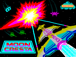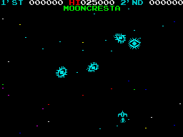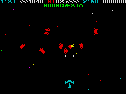 Moon Cresta is a classic shoot em up set against a downward scrolling starscape. Your three lives arrive at once as a three-stage rocket which flies to the top and separates, leaving the nose stage to descend afterwards to the base of the screen ready to do battle. If you lose that life then the two remaining stages repeat the process leaving you with the middle stage to fight on. The first stage has a single-firing laser, the second and third stages each have dual-firing lasers. Your craft moves left and right along the base of the screen while the nine different attack waves try to destroy you. There are four waves consisting of blue then yellow aliens (which split into a smaller alien when shot) and a red then magenta wave of fighters before you are faced with a docking of the first stage with the second for bonus points. The bonus is based on the time taken to dock as the top craft slowly descends, wavering about and guided by the left/right control and fire to thrust.