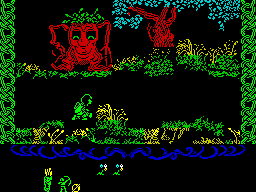 Naturally, you play the part of Robin in the game, and have to find your way through the forest, collecting weapons and killing Normans, as you search for the Sheriff’s castle. All is not sweetness and light, down in Sherwood. You don’t start the game tooled up with a variety of weapons — they have to be acquired — and apart from little blue marauding Normans out to kill you, there are a number of hazards on your route to the castle. Tread on a hedgehog, for instance, and you are wounded and can’t run so fast! Without giving away too much of the game, the odds are not stacked totally against you... if you are injured in a fight with a Norman you will be incapacitated, but you can be healed if you visit the hermit; and a friendly Ent (remember the walking, talking trees in Lord of the Rings?) can be bribed to offer you a little assistance in finding the castle. And of course, there is a witch... who can be a hindrance, or a help, depending on what you have to offer her. And the traditional Robin role can be fulfilled by beating up the fat purple Bishop, who spends most of his time robbing the poor — duff him over, get his moneybags and give them to the Ent for redistribution to the poor.