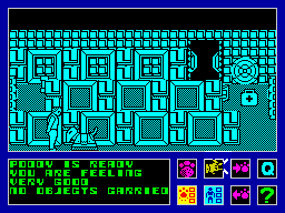 You are provided with status displays for both your character and Poddy. These are got at by use of the icon game control system. There are various icons displayed at the bottom of the screen, such as pick up, drop, drive Poddy about and so on, some of which execute a specific function while others take you to other displays and icons. There is also a HELP icon. When selected this shows all the icons and their functions.