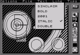 ALPHA provides text entry and any alphabetic or numeric character may be placed anywhere on the screen. There are four basic fonts which are selected with the TEXT pull down menu before entering ALPHA mode. These are SINCLAIR, BOLD, 2001 (computer style) and ITALIC, and text may be single or double height.