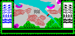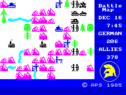 A total war zone map is displayed in bright colours on the screen. A cursor can be placed over any part of this screen and can then magnify the area below to show details of terrain and units. Terrain includes hills, marshes and plains. Units can then be ordered or resupplied as necessary. The objective is to simply defeat your opponent and capture territory. Forces are initially on opposite sides of the map on areas of land separated by a bridged river. The bridge is the only means by which an army may move from one side of the map to the other.