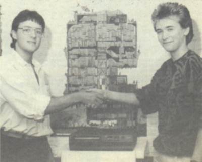 Ace cartographer Kevin Payne collects his prize for producing the best map of Saboteur in the competition Durell hosted in the pages of CRASH. Tim Hine hands the Hi-Tech prize over as Kevin smiles sweetly for the camera. Ready to map Saboteur II now Kevin?
