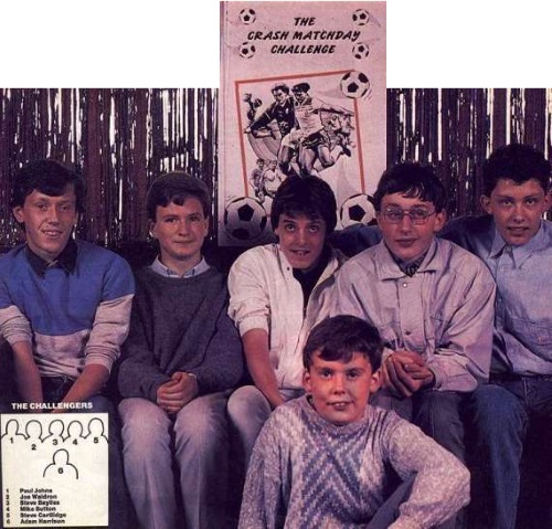 Calling their bluff, the Ed proposed a MATCH DAY CHALLENGE, where the programmers would meet the best on-screen footballers CRASH could provide. They agreed. An appeal for top-notch players appeared in the magazine, entries were sifted and a shortlist drawn up. The date was set, and one rainy day last year the programmers and challengers travelled to Ludlow from the four corners of England.