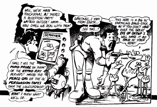 Fans of John’s work will be pleased to see that he is going to have his own strip in our sister magazine LM, in the form of Umquat The Alien — defender of freedom, seeker of truth and justice, President of the Galactic Tail Waggers Club, seeker of wisdom and cheapo souvenirs, prannie of the universe, gallumphing gourmet, and general mental incompetent. He’s also the owner of a clapped-out spaceship which keeps going ‘Phut’. Oh yes, he just happens to have a computer disguised as a rather curvaceous looking alien.