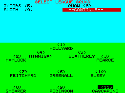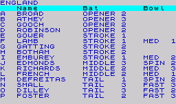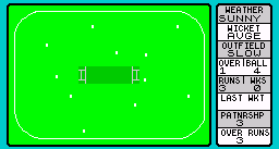 Once the team is selected, the match can begin. When his team is fielding, the bowler can alter his own bowling line and move the field into positions of his liking. Bowling and fielding is automatic and the minimalist graphics show the fielders and a rough guide of where the ball travels. Underneath the graphic display, text messages flash up describing how the ball was hit, how many runs were scored plus other useful facts.