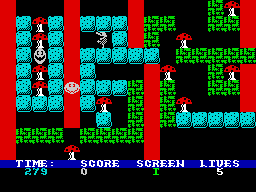 With spritely vigour he can run along, and drop off, the ledges of rocks that make up the majority of the maze. Also part of the cave interior are the vertical red zoom tubes, which allow him to scamper up and down between levels.