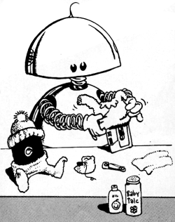 It’s all down to fine tuning now. I’ve been using the Coupé as a word processor, 84 columns in its ‘serious’ Mode. There’s a single command for changing the size of characters in any Mode, up to 32 pixels high. I can see that being used in infant schools, shop displays, and also the visually handicapped can benefit. They haven’t written the network commands yet, so I can’t test out the potentials there, pity. Andy has just about finished adding new software features, including an amazing automatic ‘pretty’ listing/renumber routine. Robin Evans has turned my cartoon scribbles into a non-ageist, non-racist, non-sexist character called SAM (made of metal with no ‘thingie’!) I’d better start the specifications bit, indexing and all the techie stuff.