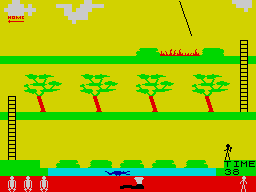 Jungle Trouble is one of those games which looks a bit naff and tricky to cope with — but you just won’t be able to stop playing it until you reach the end. It could drive you barmy! You start on the right hand-side of the riverbank; the first task being to successfully cross the river using the stepping stones without falling into the water where a furious croc swims. Before you start off, collect an axe by running to the far right of the screen, an axe icon should now appear at the bottom of the screen. Okay, here we go...