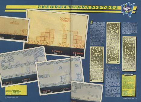 Wow, The Great Giana Sisters! That was quite a time for me. It was my first issue in charge of the mag, and I had all the pressures that come with being an editor yet I was only 19. I had companies hassling me like crazy to get a CRASH Smash, and can reveal that I caved in when it came to The Great Giana Sisters. You see US Gold, who owned the Rainbow Arts label, were struggling for hits at the time, yet were one of the biggest advertisers in the mag and had a lot of clout with “the powers that be”. Their PR people were putting pressure on me saying that it was going to be great game and we could have the exclusive if we could guarantee them the cover picture, and I was desperate for a big exclusive on my first issue as editor. I kept trying to say to them that we needed to see the game first, but they kept on putting it off. So I was left having to make the decision to get Oli Frey to do the artwork in the hope that when the game did finally arrive it would be a good game and warrant a CRASH Smash. Of course, in the event it was a crap game but we didn’t have much choice than give it a CRASH Smash as we’d put it on the cover. I didn’t have much of a like for PR people before that incident, and I’ve had a strong dislike of them since... I’m not sure why it didn’t actually see the light of day though. I think it was some licensing wrangle with the coin-op people and US Gold. (Anyway, don’t worry, you didn’t miss anything!)
