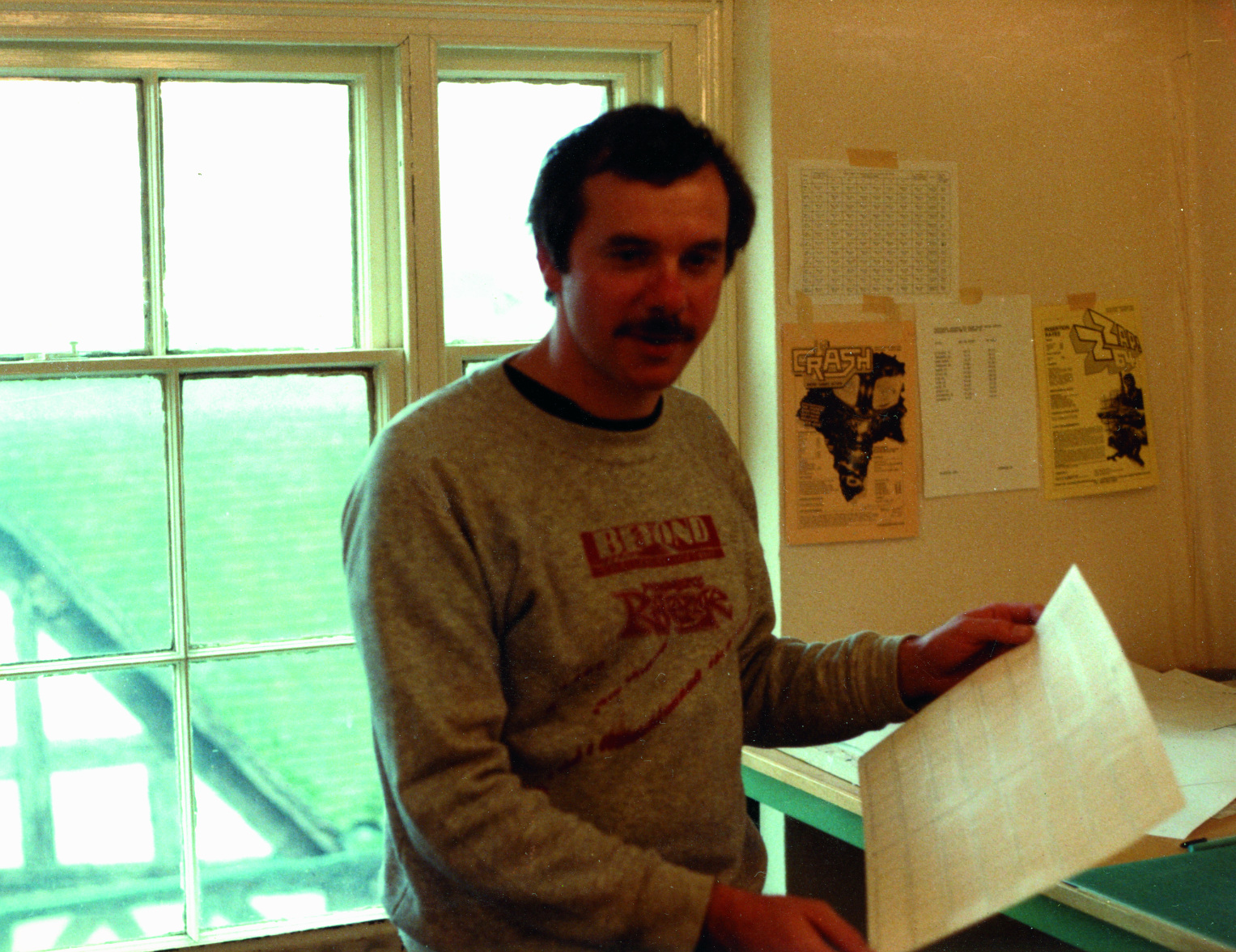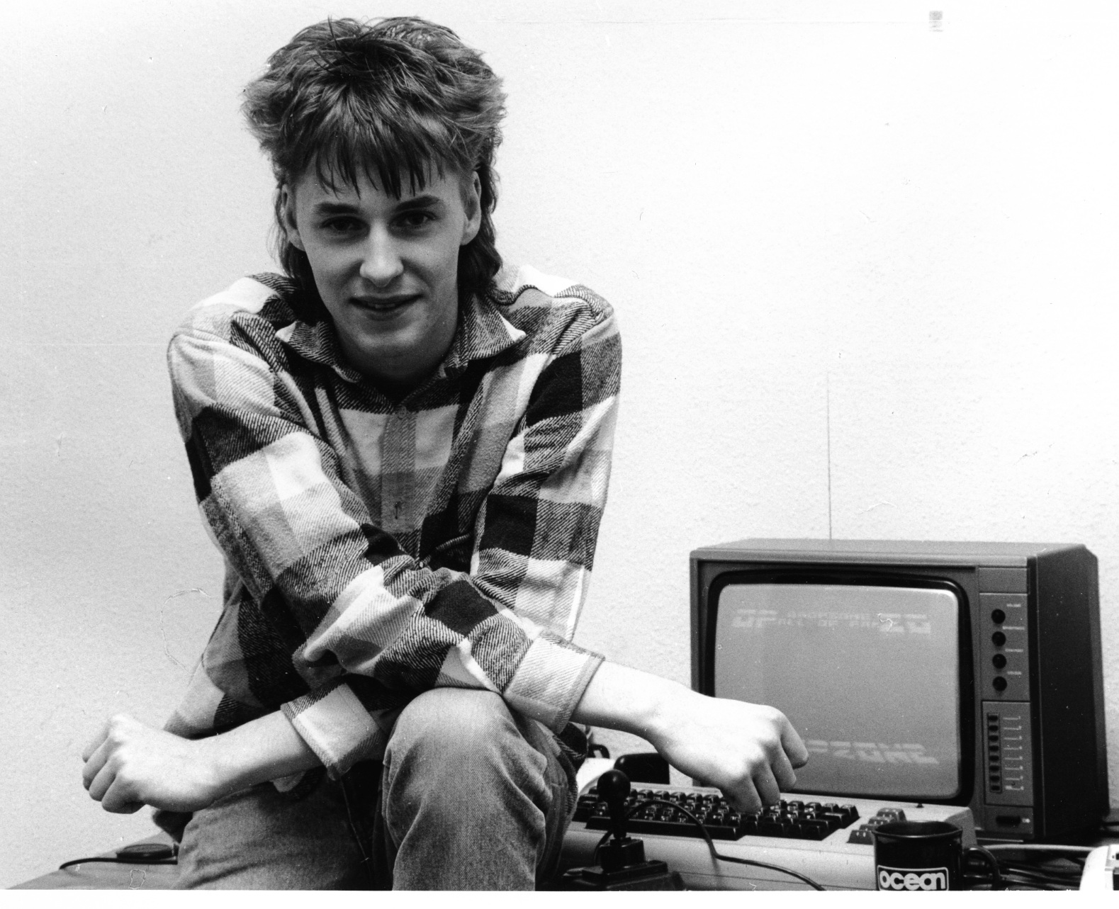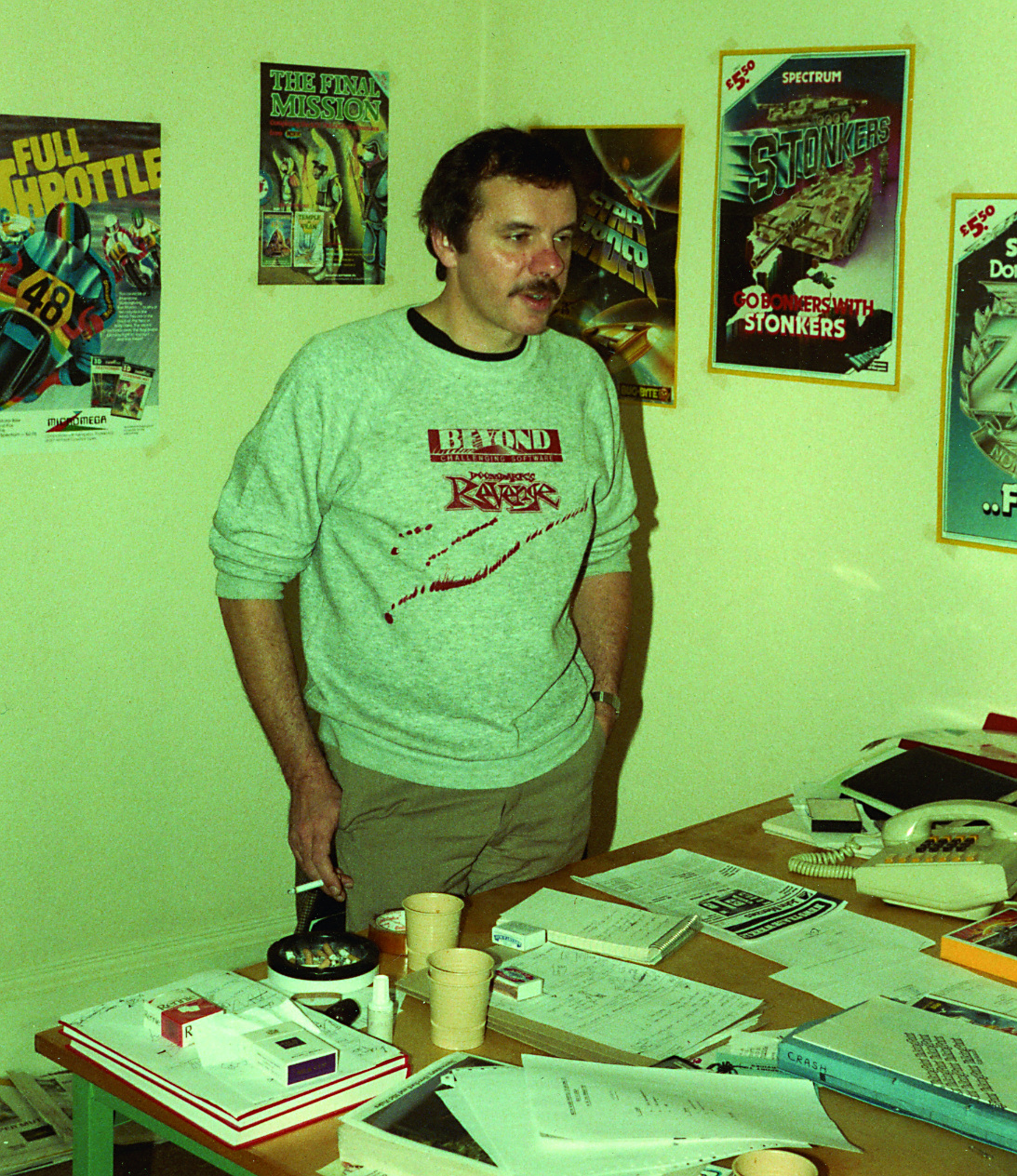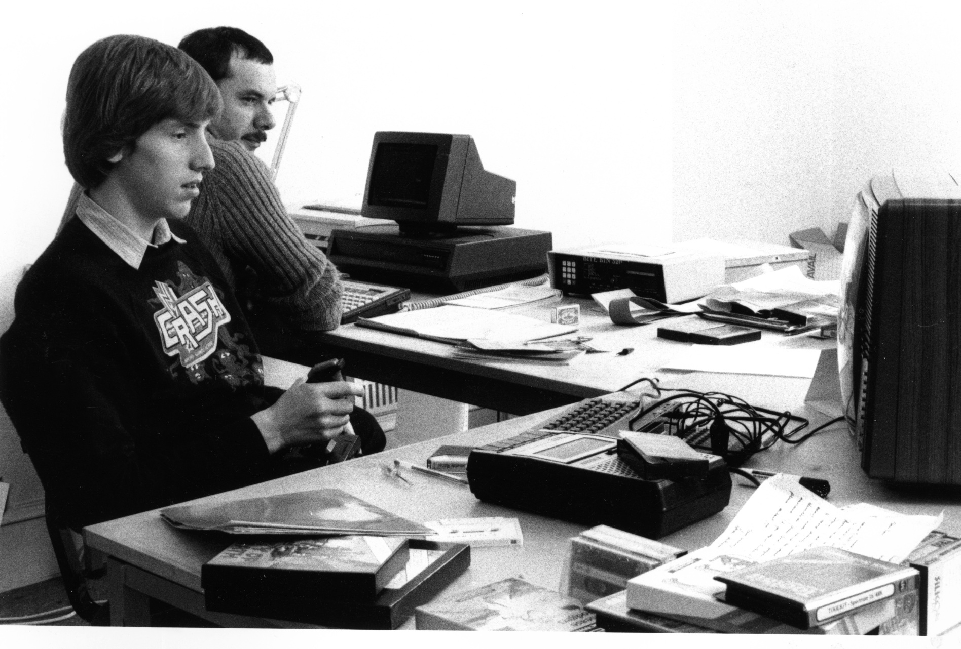 1989, modelling the new Thalamus Games T-shirts (unwillingly on Robin’s part) |