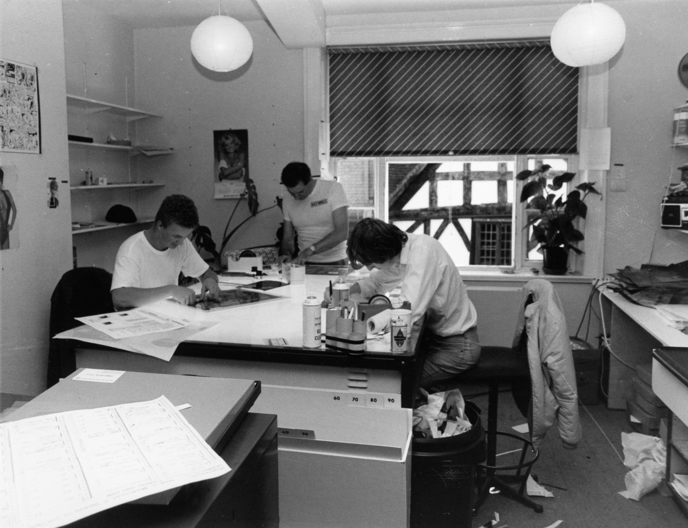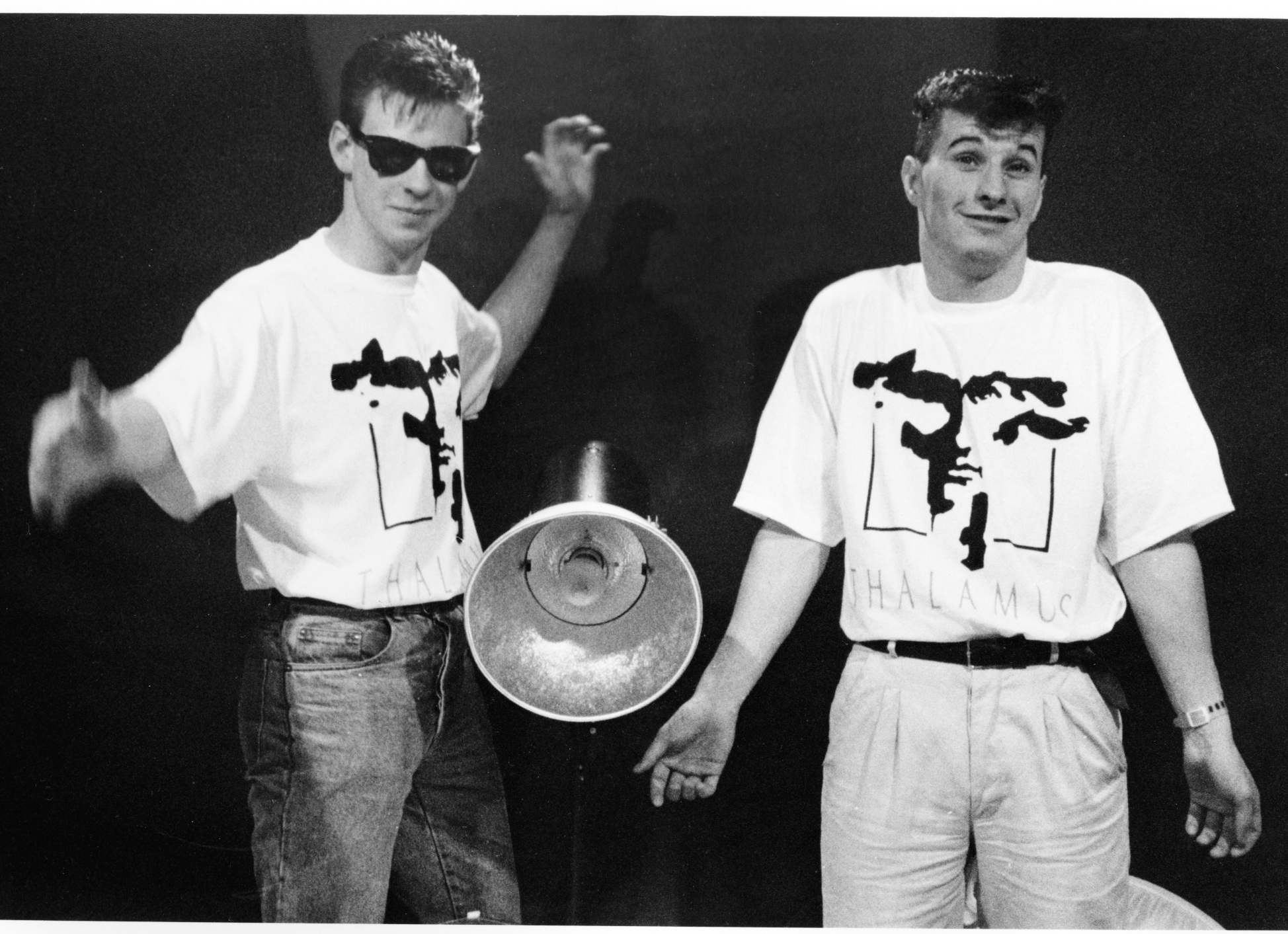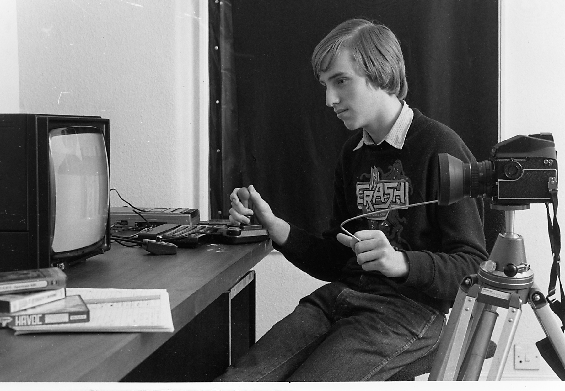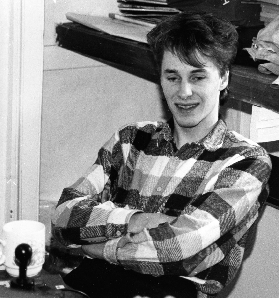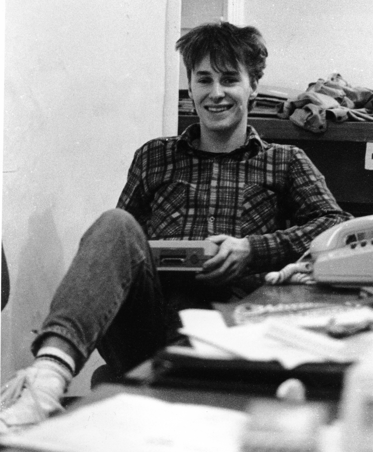 1989, modelling the new Thalamus Games T-shirts (unwillingly on Robin’s part) |