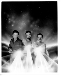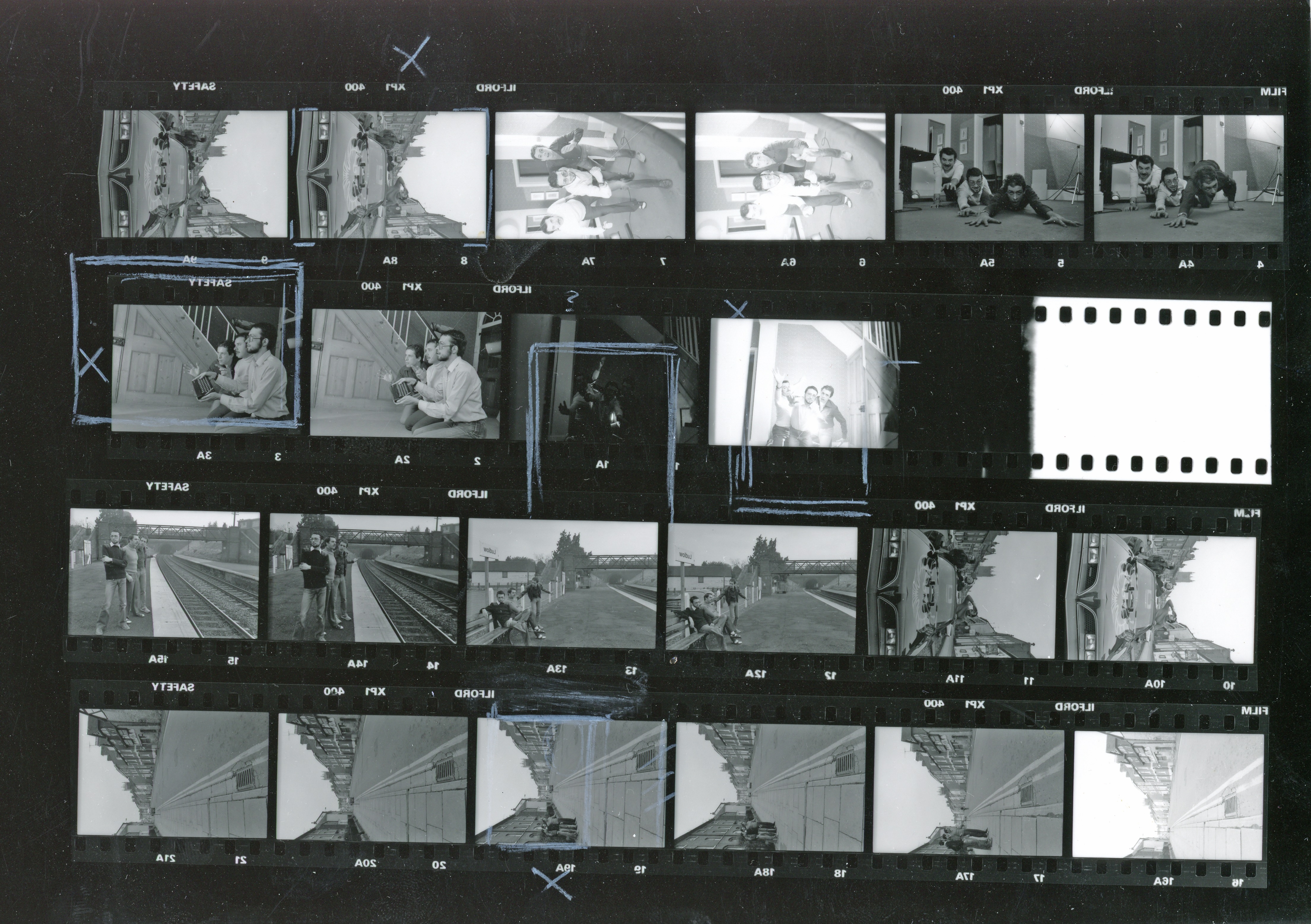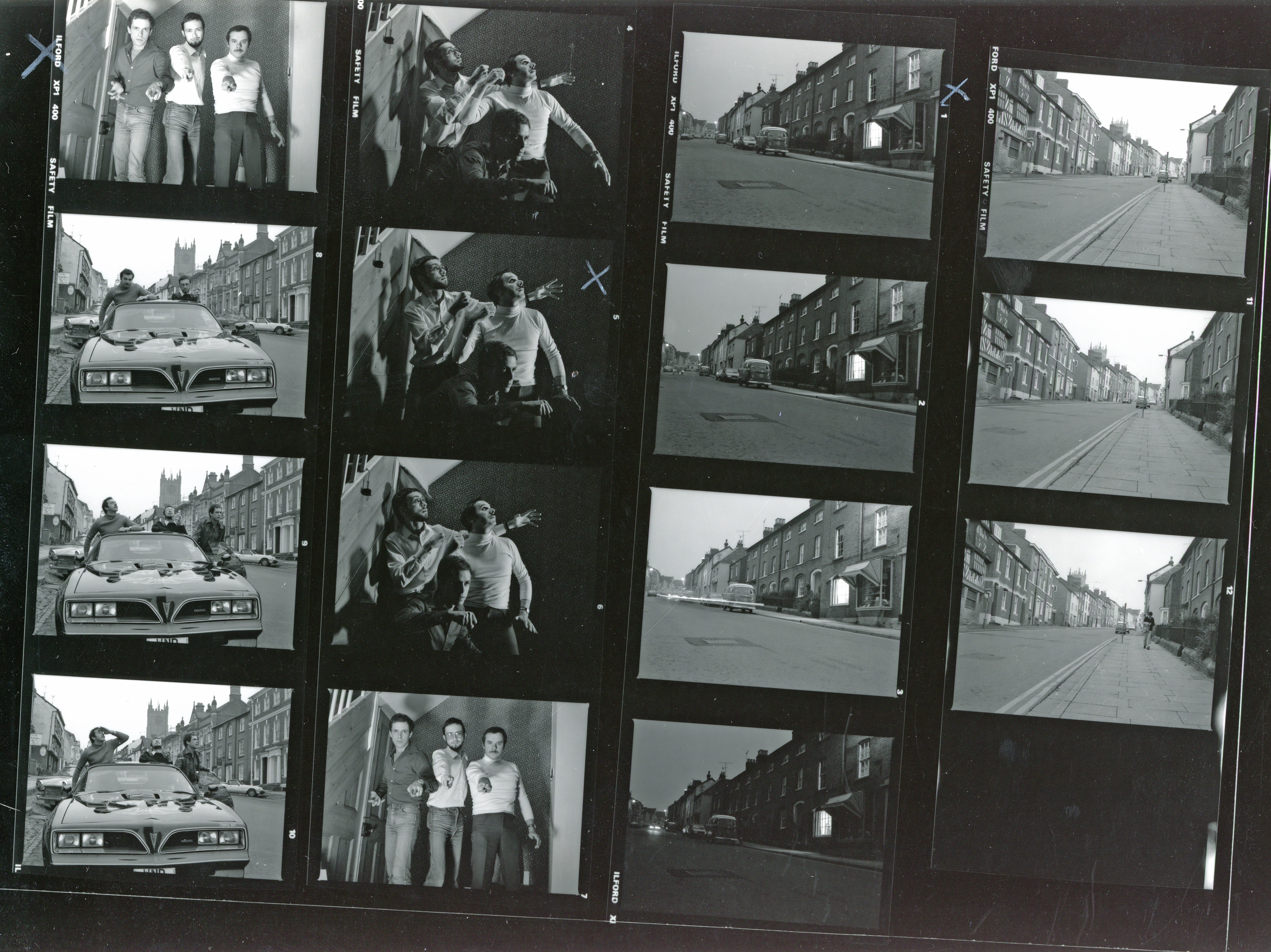 | Negative contact sheet for PR photos taken mid-year 1983. This one includes poses for the Transam scene, and four others we never used, including one on Ludlow railway station. The two top right (crawling on the floor), were to be turned on their heads so we would be scaling a skyscraper by the time Oliver finished painting it all in… Actually, I’m rather sorry we didn’t do that one. :) |