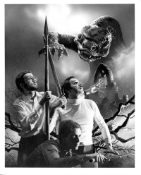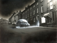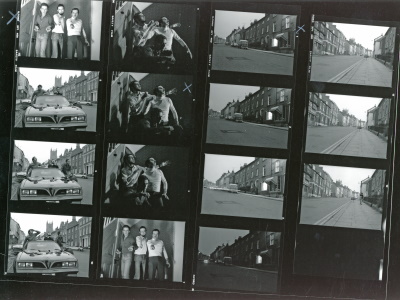 | Negative contact sheet for PR photos taken mid-year 1983. This one includes poses for the “ray gun” shot, the Transam in Ludlow pose (though I think a 35mm picture was finally selected), and the three fighting monsters pose, all photographed in the hall/dining room of 85 Old Street. 16x20 prints were made for Oliver to paint on. On the right: several shots of Old Street outside No. 85 looking uphill towards the centre of town for the mail order ad used in other magazines during late 1983, earl 1984. |