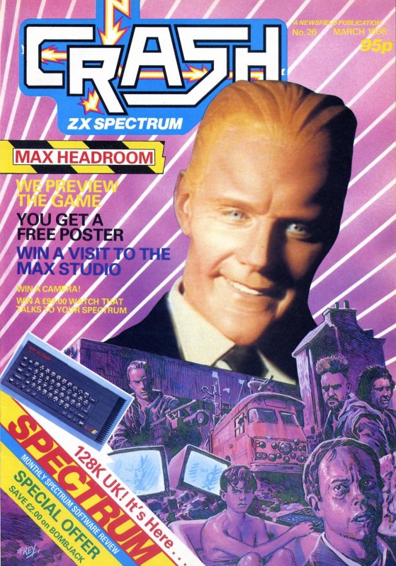 The March cover was, and still is, only the second CRASH cover to feature a photograph as its main element (the first was Issue Six’s, a photo of several assembled pieces of Oliver’s artwork). Max Headroom had become something of a cult on TV, and for the subsidiary pictures Oliver drew on images from the specially-made feature film about how Max came into being. The trouble was that as Max was already a created image, Oliver thought painting him ran the danger of making him less than instantly recognisable, hence the photo.
